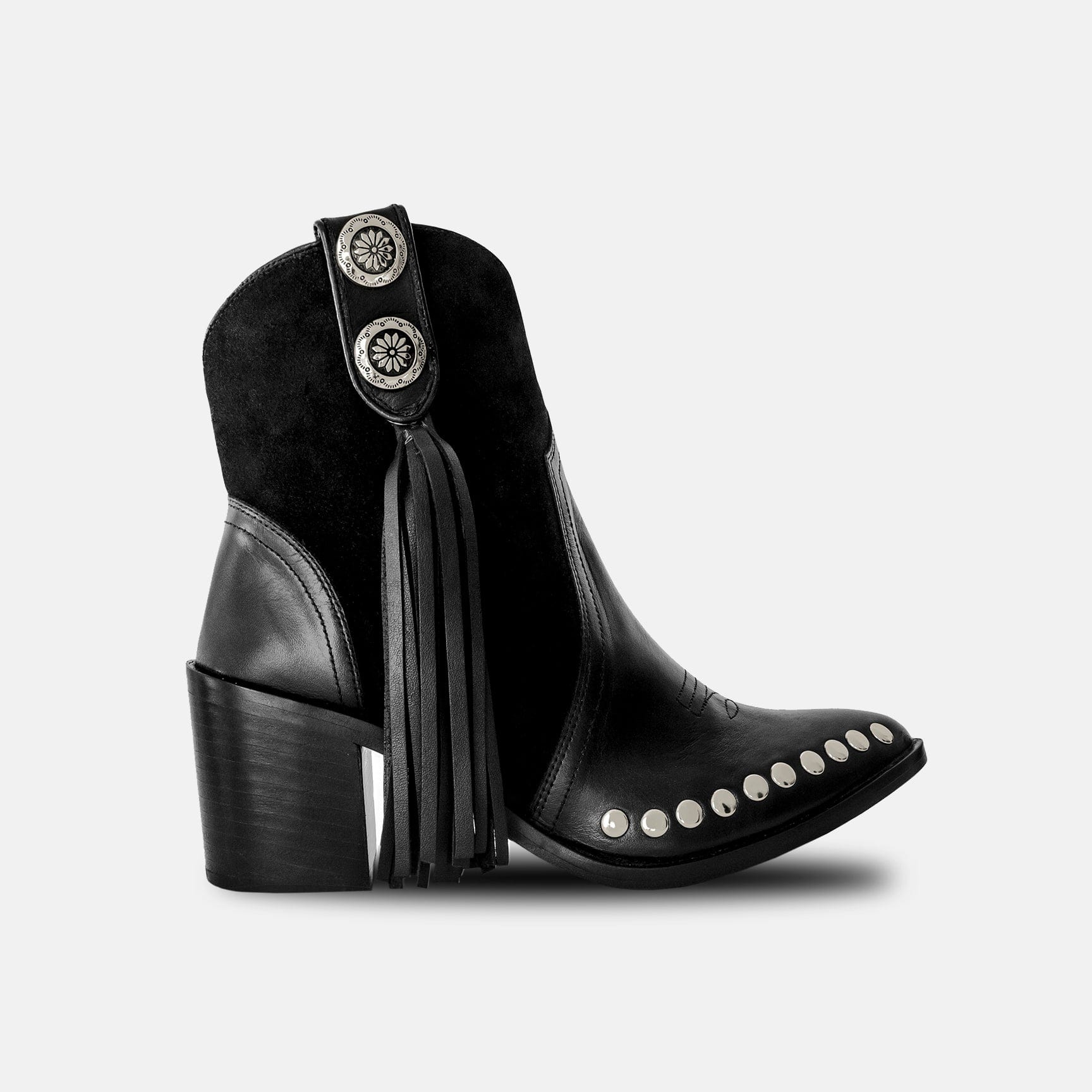 Tyro Black Boots de BALA DI GALA: Botines cowboy 100% hechos a mano en gamuza y cuero negro, inspirados en un estilo western-chic. Diseñados para la mujer moderna que se atreve a explorar nuevos estilos. Confeccionados artesanalmente en México con 100% cuero. Primer cambio de talla gratis en España.